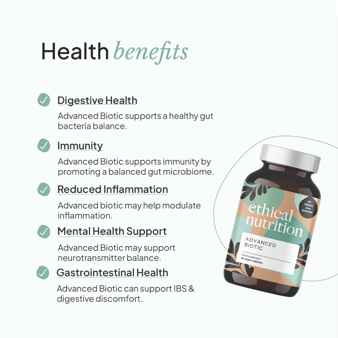 Probiotics like our Advanced Biotic help maintain a healthy and diverse gut microbiome and optimise the gut-brain connection for overall health and wellbeing.