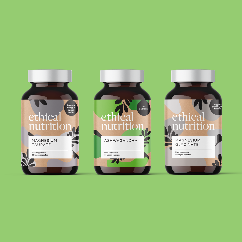1 month's supply. Take 2 capsules of magnesium glycinate and Ashwagandha in the morning and 2 capsules of magnesium taurate at night. Most supplements are best taken with food.