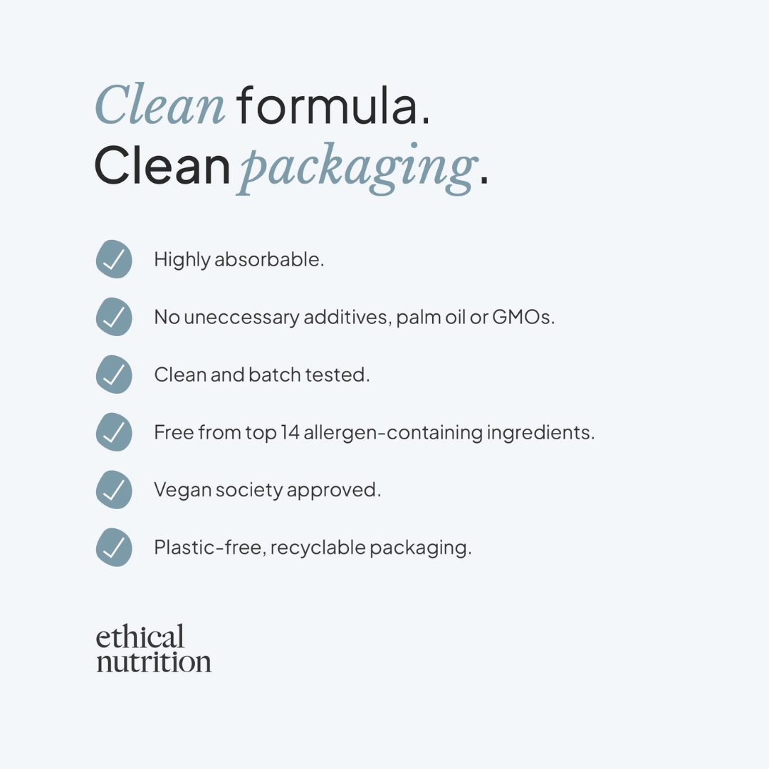 You won’t find any unnecessary fillers, binders or additives in our supplements. They’re free from GMOs, palm oil, flavourings and the top 14 allergen-containing ingredients (including gluten, dairy, soy, and nuts). All of our products are registered with the Vegan Society.